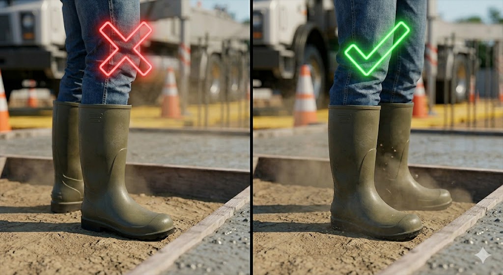 PPE Directive: Pants must go over the outside of rubber boots to prevent funnelling wet concrete against the skin.