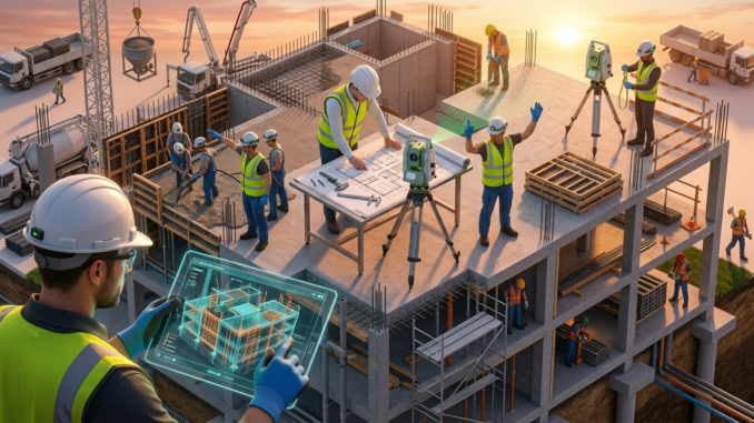 Isometric view of a construction site showing a site engineer, foreman, QA inspector, and safety officer performing their respective duties.