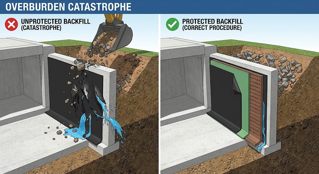 The “Overburden” Catastrophe: Overburden refers to the heavy materials layered over the waterproofing membrane, such as backfilled soil, concrete screeds, or heavy mechanical equipment. When membranes are left unprotected, pouring concrete directly onto the membrane or dragging heavy tools across it causes microscopic punctures. Because the membrane is subsequently buried, these punctures remain hidden until the structure floods.